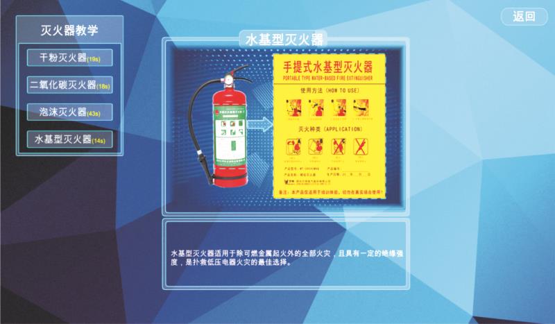 虛擬滅火體驗實訓(xùn)系統(tǒng)采用公司自主研發(fā)的動作識別系統(tǒng),3D 虛擬現(xiàn)實、無線通信等多種先進 技術(shù)手段。該系統(tǒng)分為消防教學(xué)、模擬演練、隱患排查三大部分。虛擬滅火體驗實訓(xùn)系統(tǒng)配置 多種檢測、評測模塊,通過對滅火器狀態(tài)的數(shù)據(jù)采集實現(xiàn)整個滅火流程的測評,達到自動檢 測、自動判斷、自動評分的效果。