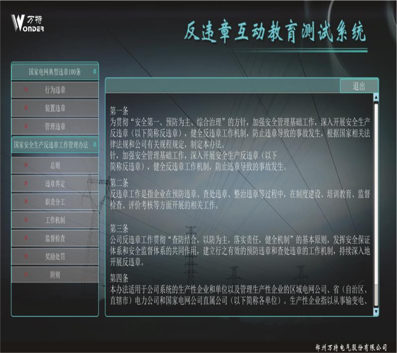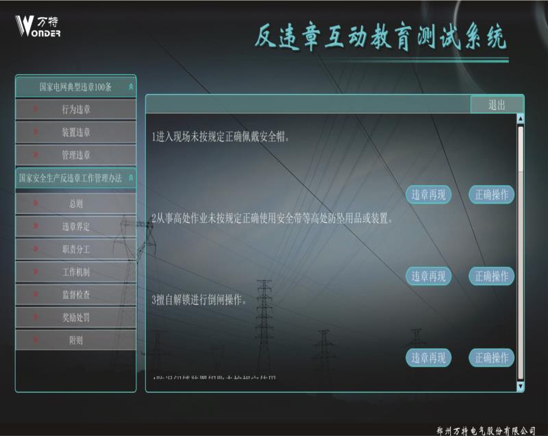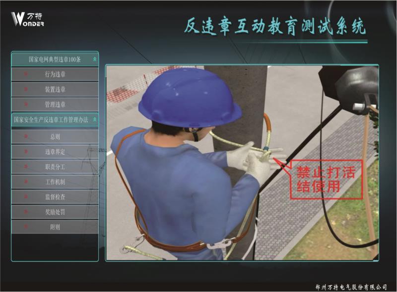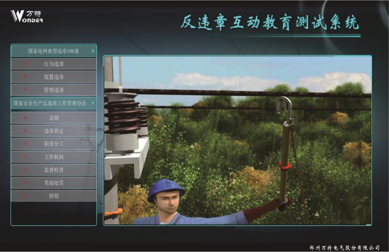 反違章互動測試系統設計案例依據國家電網公司編寫的 《國家電網公司安全生產違章100條》,進行編制相關 事故,遵循《國家電網公司電力安全工作規程》進行正 確動畫的制作。反違章互動測試系統運用三維動畫等先 進開發技術逼真還原事故過程、事故現場,突破了傳統 安全教育不能用視頻重現事故過程的缺點。更真實的展 現違章作業過程,更直觀的感受到違章作業后果,更深 刻的理解遵章作業的重要意義。