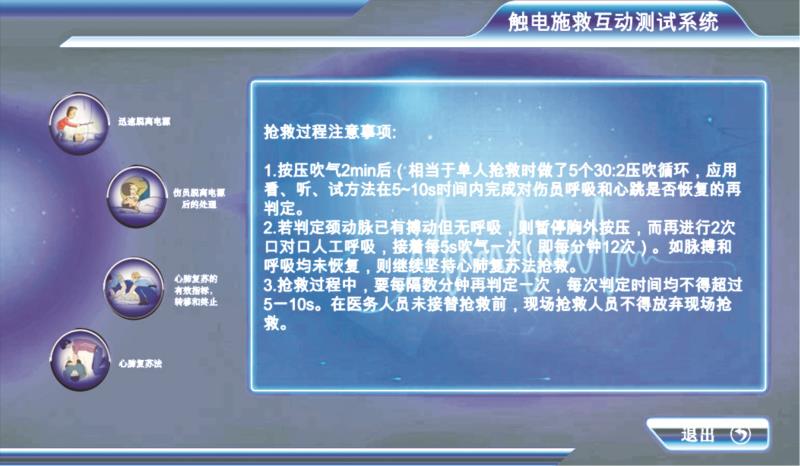 以情景再現(xiàn)方式模擬虛擬 場景下觸電事故現(xiàn)場,讓 學員選擇不同的物品進行 施救,掌握發(fā)生觸電事故時使用正確的物品進行施 救,掌握怎樣使傷者正確 脫離電源的步驟。掌握現(xiàn) 場心肺復蘇正確方法,系 統(tǒng)記錄學員施救過程并給 以評判結果。